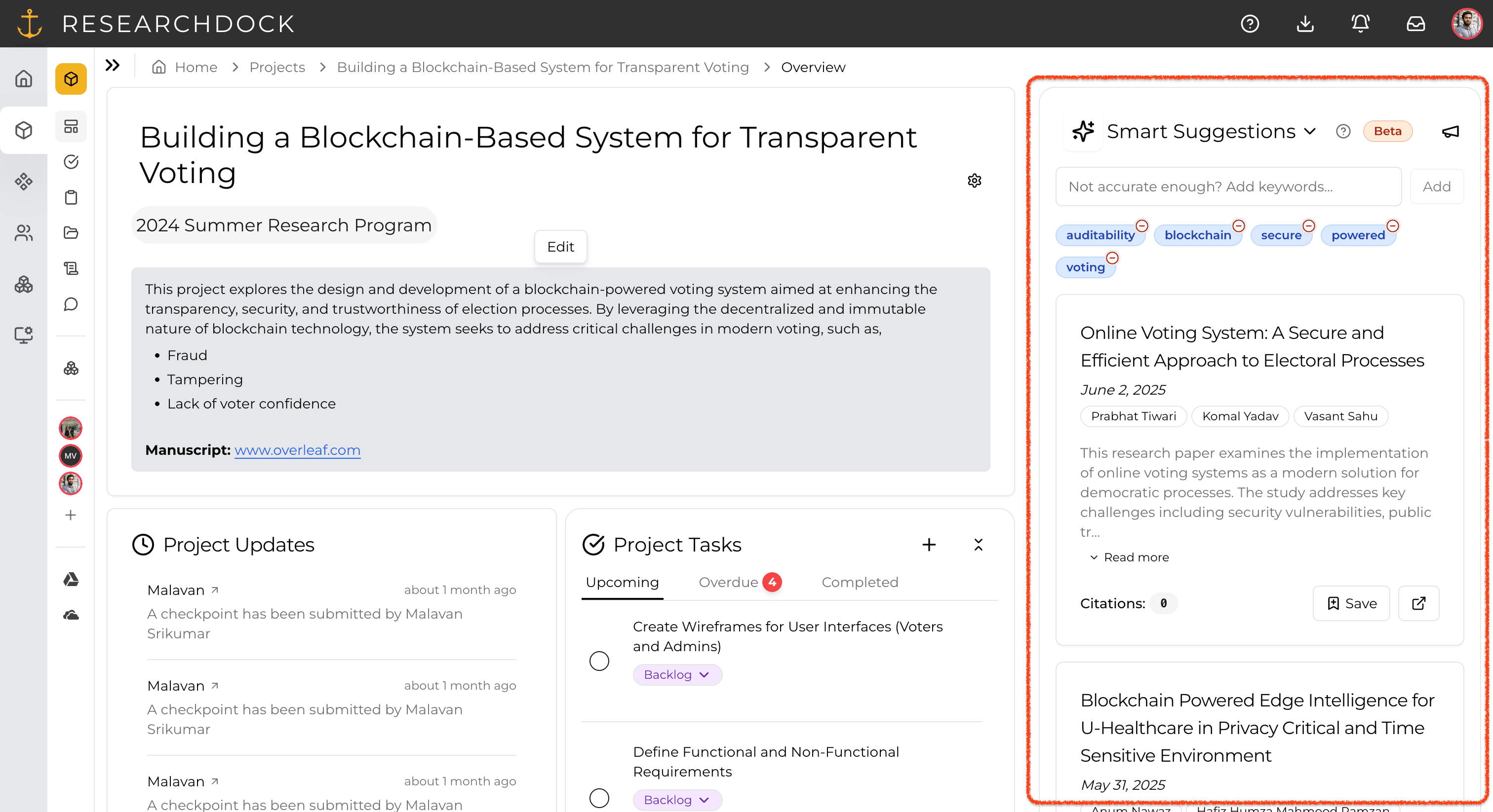 Keeping up with relevant literature can be time-consuming and overwhelming in academia. That’s why we built ResearchDock’s Smart Suggestions feature: an intelligent system that suggests papers based on the keywords inferred from your project. It's like having a personal research assistant helping you stay on top of the most relevant work in your field.